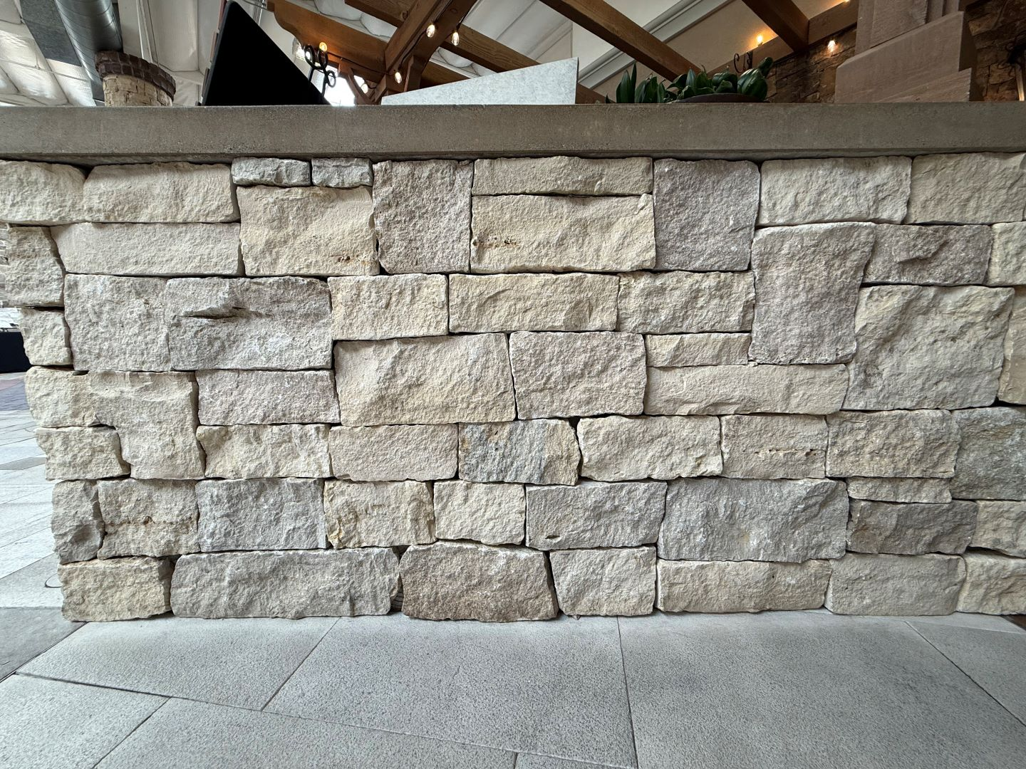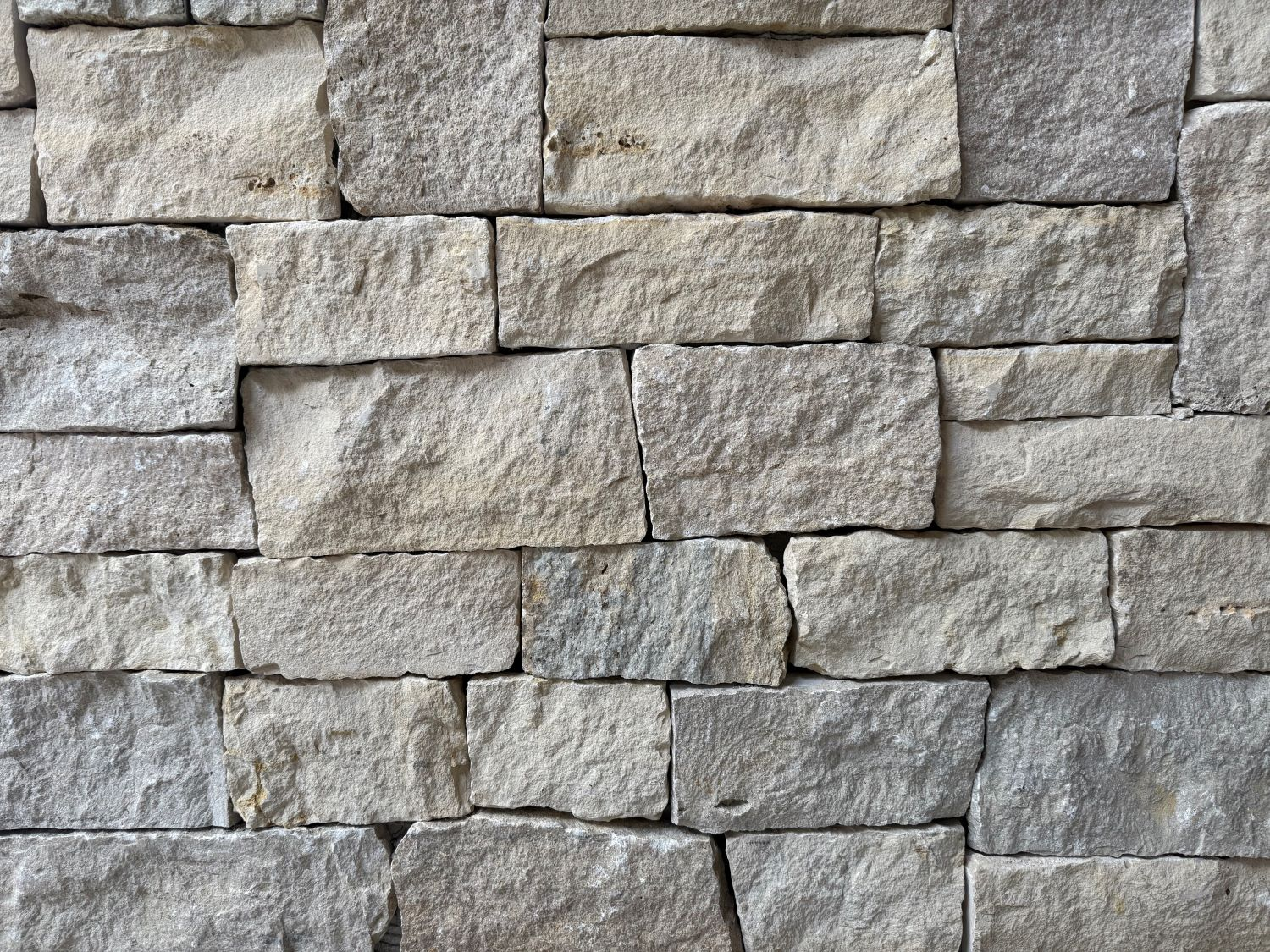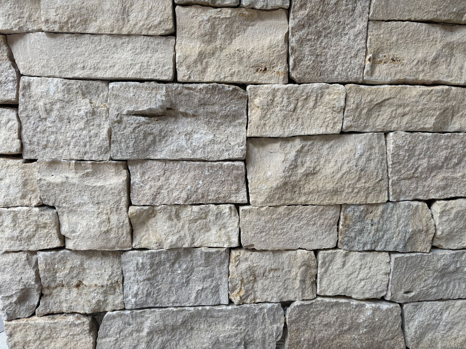 Monteverdi Rubble features softly textured stones in pale, creamy beige and light gray tones. The shapes are irregular and organic, with a mix of rounded and angular edges that give the layout a natural, unstructured feel. Surfaces appear weathered but not heavily textured, with subtle color shifts and occasional white mineral streaks. The mortar is light and clean, blending smoothly with the overall muted palette.
